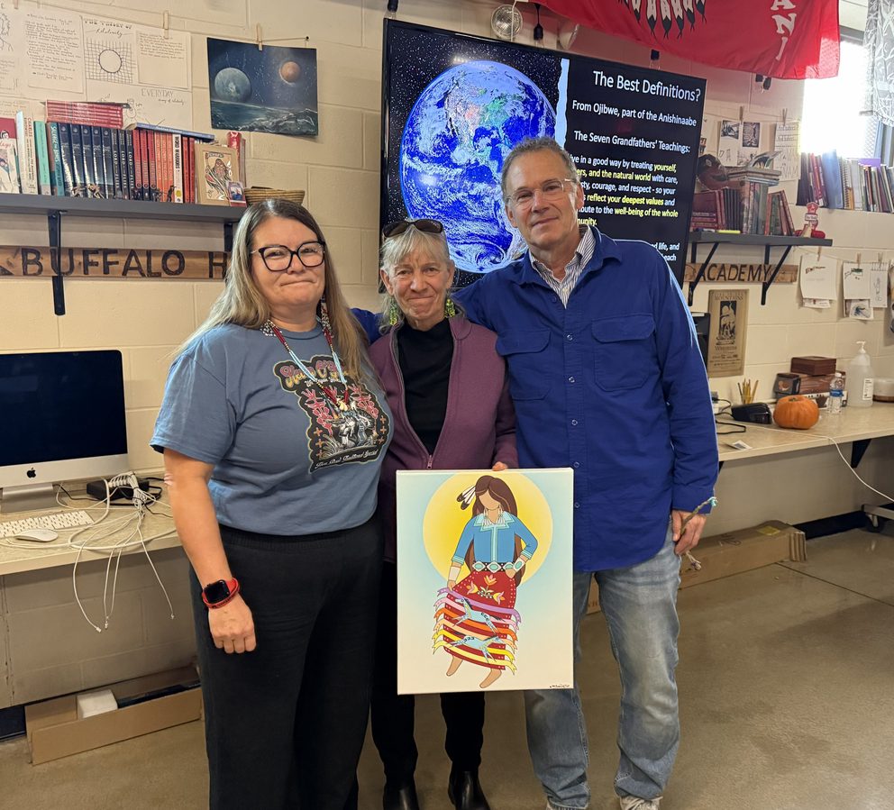 This photo is of Lynnel Bullshoe gifting Rita beautiful Indigenous art at a two-day workshop in Browning on the Blackfeet Reservation.