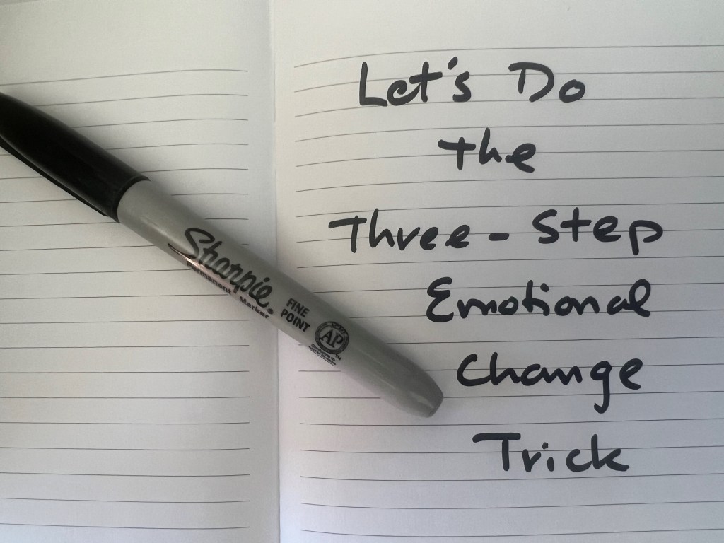 Nearly always there was a head nod; I’d join in and admit to the same. “Damn those bad moods. Sometimes they last and last and hang around way longer than they need to. How about I teach you this thing I call the three-step emotional change trick. It’s a way to change your mood, but only when YOU want to change your mood. You get to be the captain of your own emotional ship.”