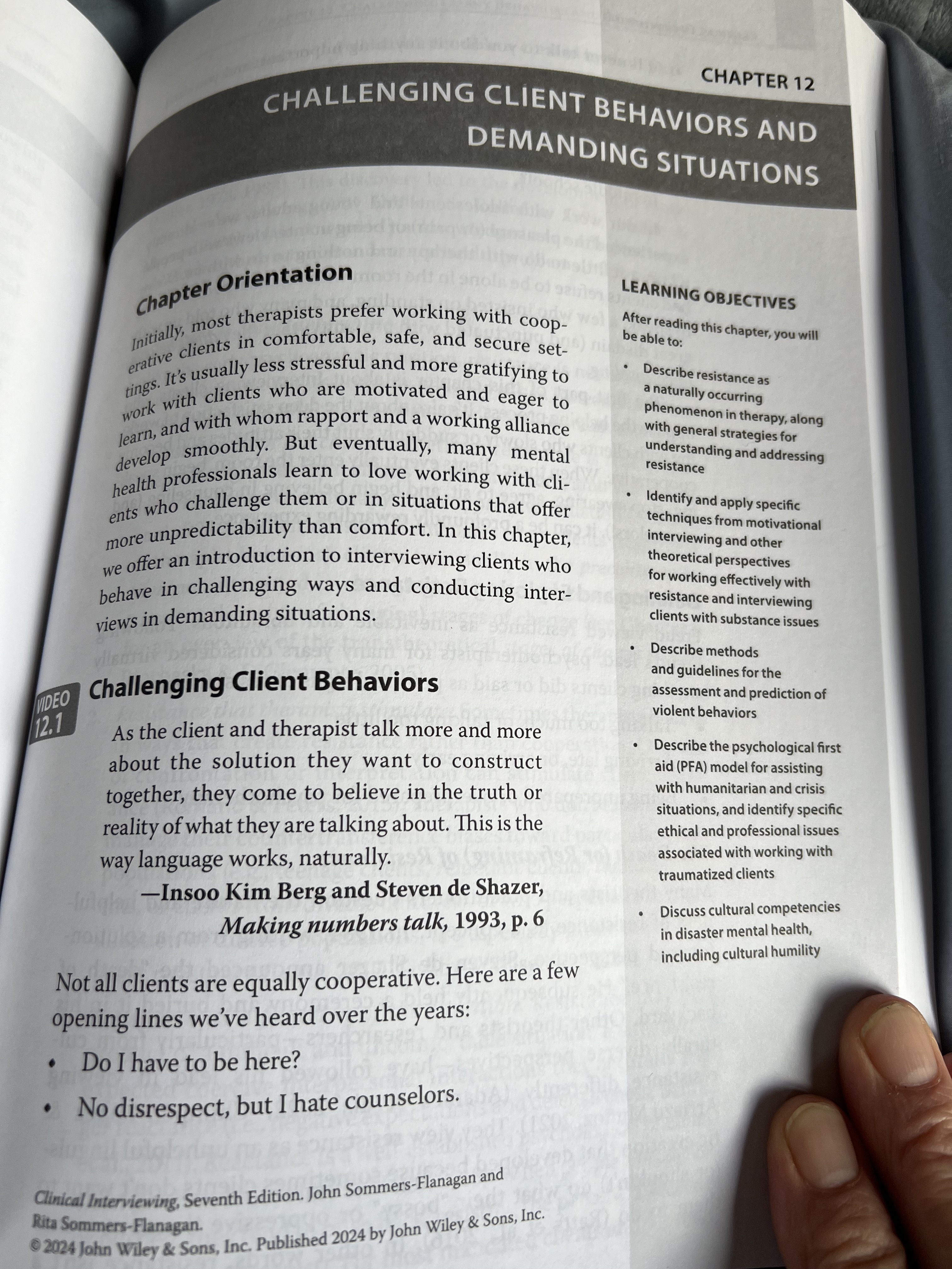 The answer to that question is complex, as it should be. In part, my answer today is to include an excerpt from Chapter 12 (Challenging Client Behaviors and Demanding Situations) of our Clinical Interviewing text. This excerpt starts with the topic of “Challenging Client Behaviors” or behaviors that clients engage in that counselors and psychotherapists often find challenging. The content includes a discussion of the concept of “resistance,” MI strategies, as well other ideas of our own and from the literature.